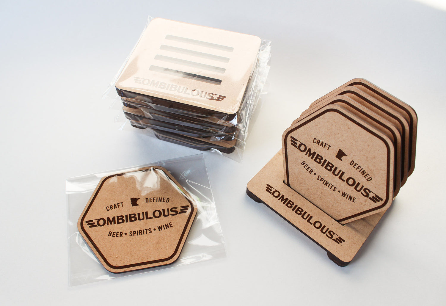Custom Coasters for Ombibulous Liquor, the Twin Cities’ first and only liquor store selling 100% Minnesota-made beer, wine, and spirits.